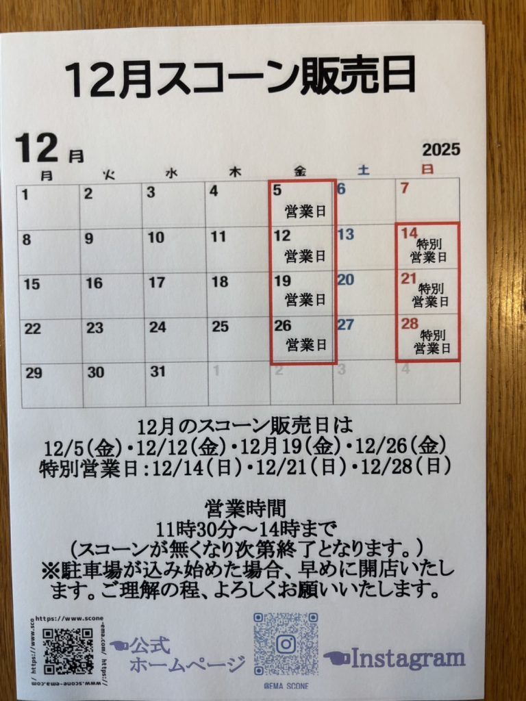 そのため、1日に作れるスコーンの数に限りがあります。今後は店頭に販売できるスコーンの数や種類を増やし、お客様に喜んでいただけるよう努めたいと思いますので、何卒ご理解の程、よろしくお願い致します。